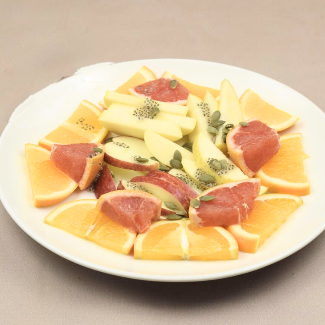 Green & Red Apple, Orange, Grape Fruit; Topping Chia Seeds & Pumpkin Seeds Excluded